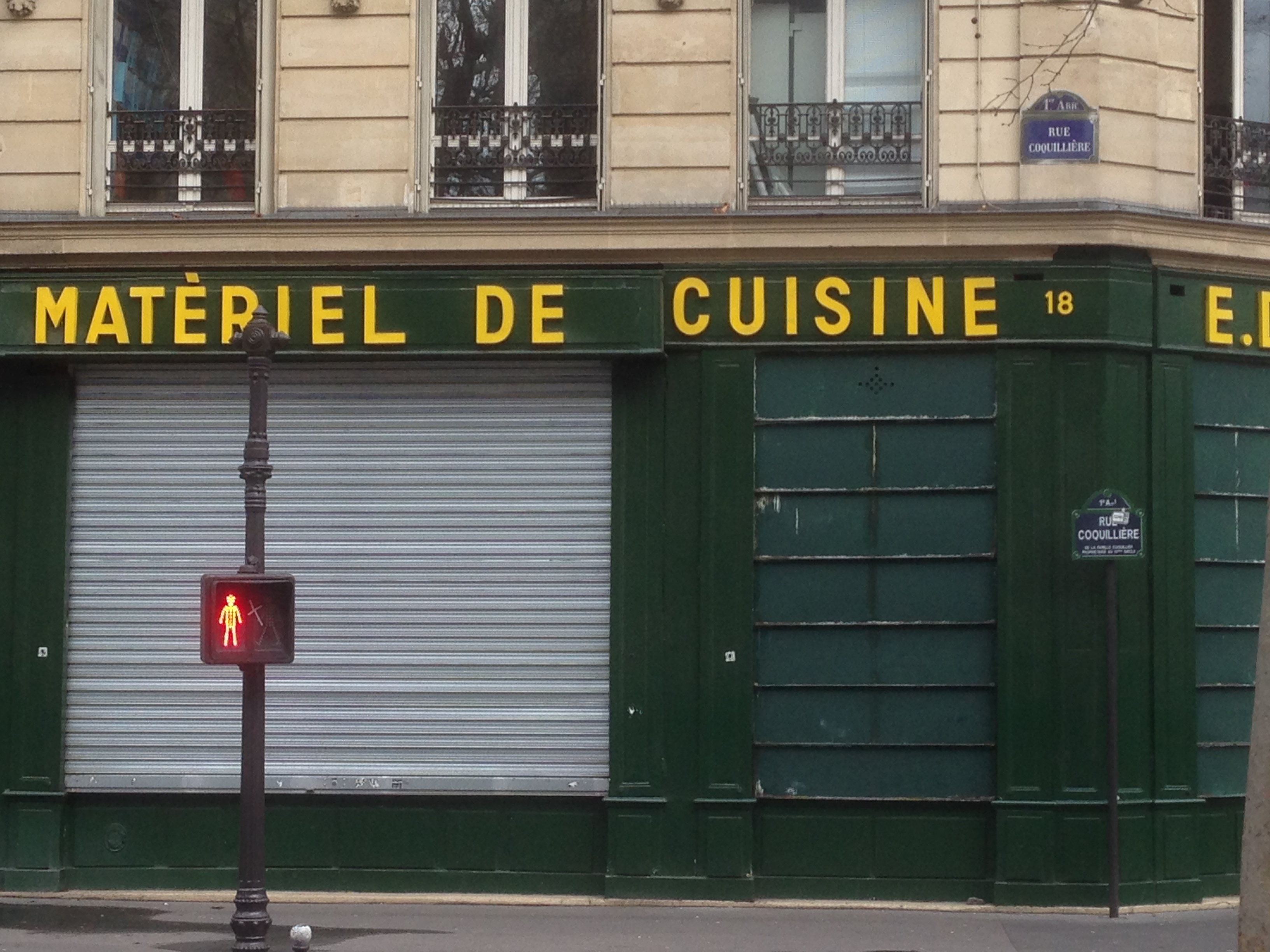I continue to look for a tall, thin, probably ever-so-slightly conical glass to drink my alcohol-free beer from. Not long ago the whole area around the bottom of Rue Montmartre was littered with restaurant and catering suppliers. They have now become cook shops. It seems that as the world has gone more colour-supplement, so that the simple drinking glass has got much thicker and convoluted in the functions it serves. At the same time, it is amazing how many gas-station freebies you see on café and restaurant tables. Maybe Dehillerin will have something of suitable – as plain as their frontage. SC