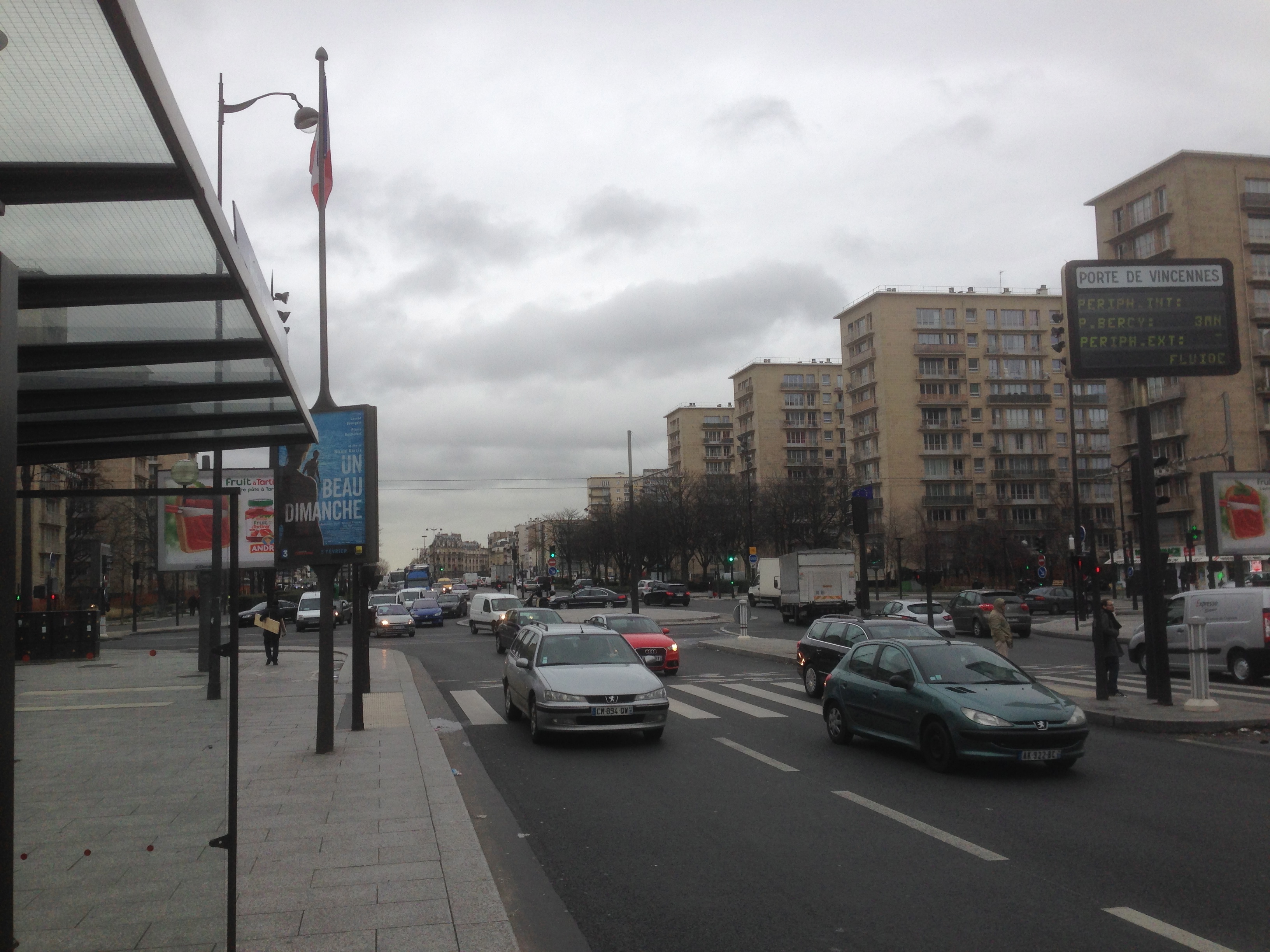 It’s been a busy week, and we’ve not really fitted in many Portes . We did start at the beginning of it from Vincennes, which turned out a Boulevard walk, on wide alleys. Here the traffic streams from the périphérique, entering the city. We pass Nicky Bell and Ben Langland’s Metro facade for the Vincennes station in all its plain-ness, and head towards the columns of Place de la Nation on the imperial Cours de Vincennes. It is as wide a street as I have ever walked on. At Nation, Boulevard Voltaire throws a magnificent oblique all the way down to Republique. You can see it elegantly elevated just above a rise at the end.