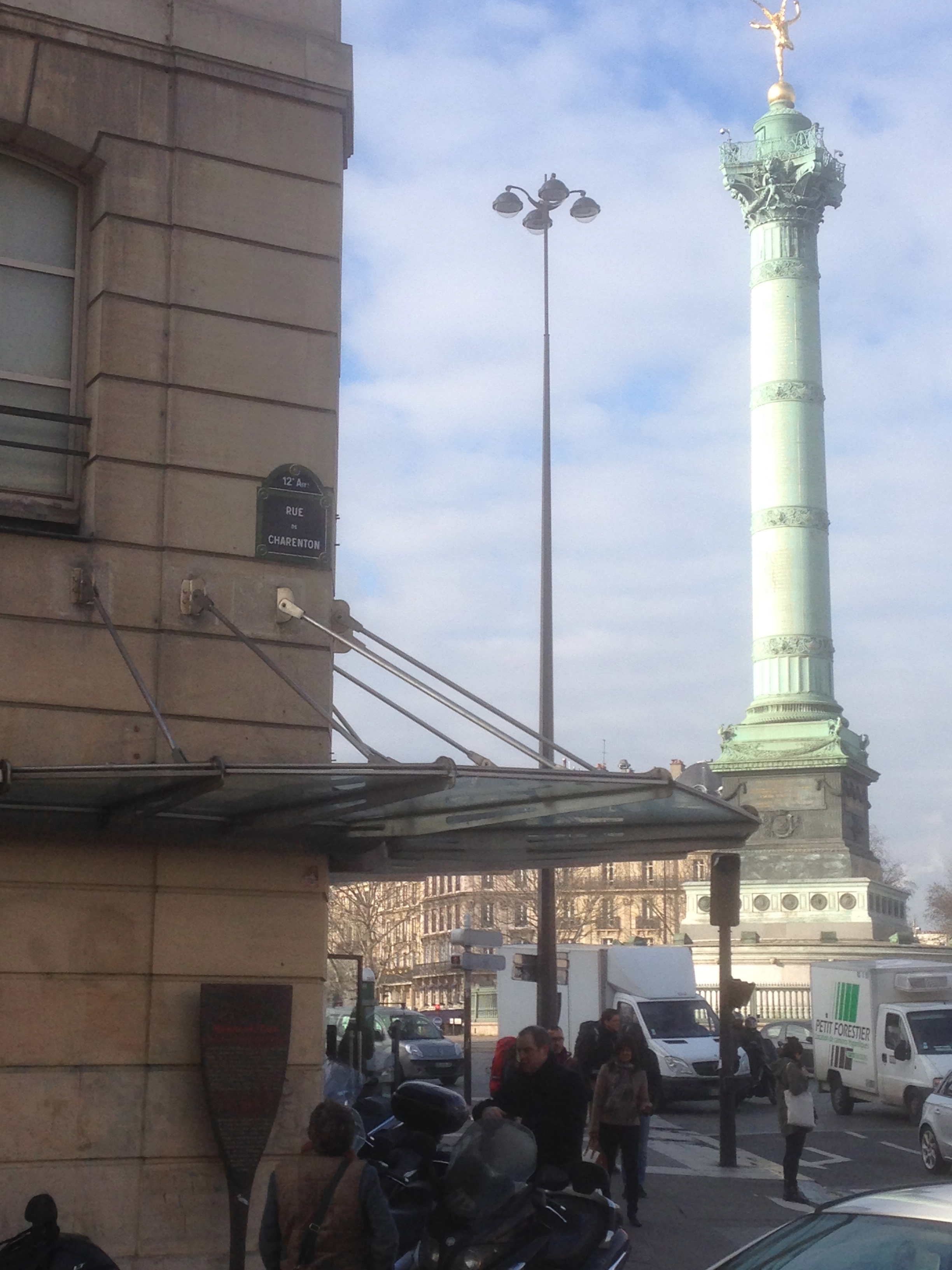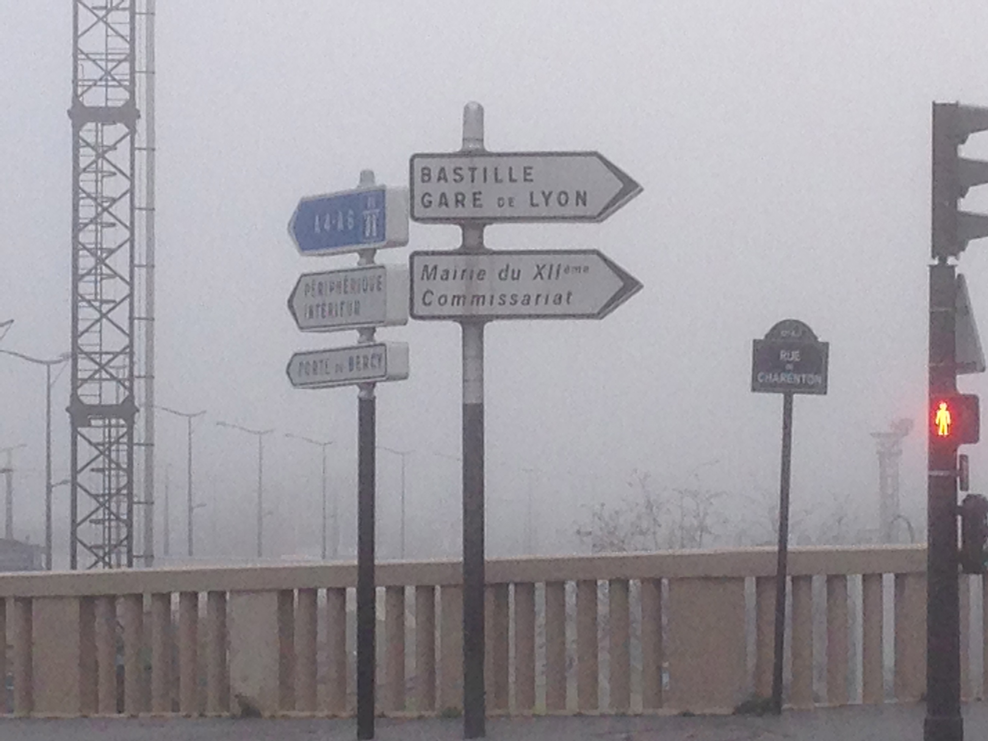 We began to walk in the fog of a winter morning on the outskirts of the city and ended in full sunlight of the Place de la Bastille, after slight contortions of the obliques of following our named road, as ever in Paris, where roads have been layered on older roads, and obscure spurs lead out from conglomerations of roads in circuses. Nonetheless, Rue de Charenton represents a more or less straight line through the city, an idealised notion for the walks we have invented.SC