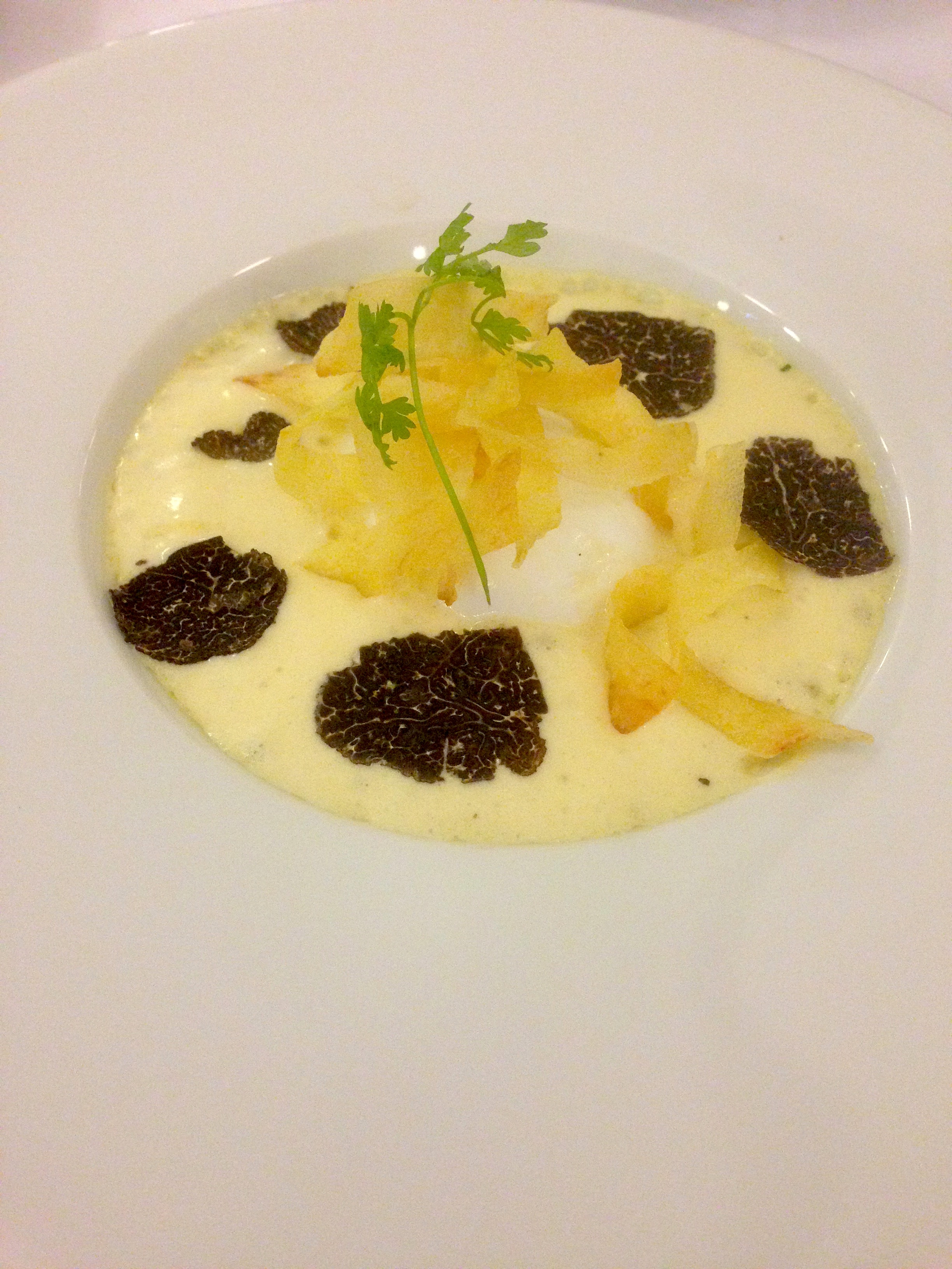 But this dish of a perfectly boiled egg sitting in what the restaurant described as ‘a cappuccino’ of potatoes, was the best thing I have seen and eaten yet on this visit. I don’t really hold with this cappuccino notion.It was really a very fine and fluid pommes purée, perfectly blended and of such a consistency that when the egg broke, it formed a perfect emulsion. On top were some shards of the finest potato crisps ever seen. And of course generous slices of perfect truffles.The blend of truffles and eggs is one of the greatest things ever, waiting to be discovered, for the palate. Nothing else excites and etherealises their flavour in quite the same way. SC
