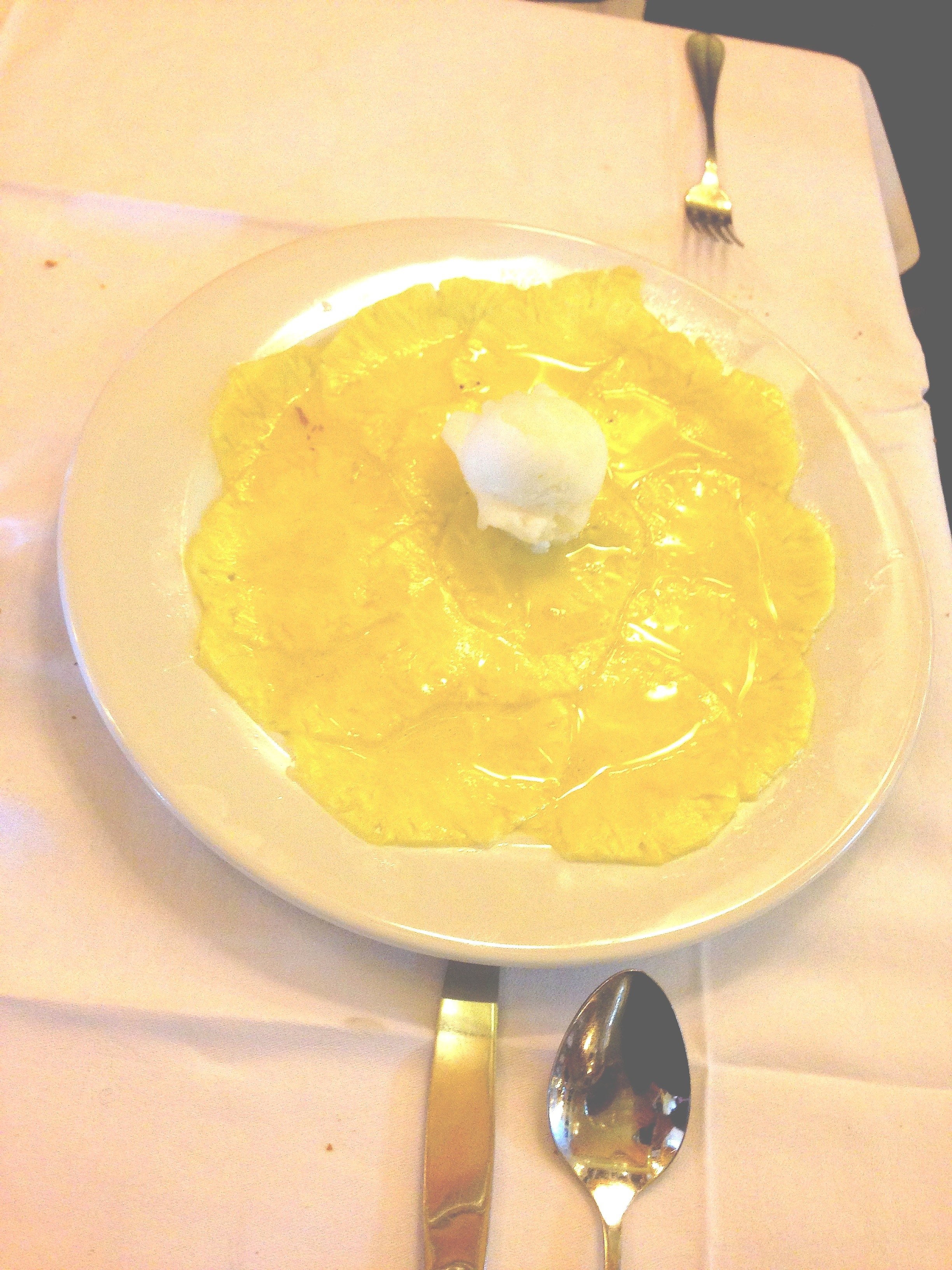 Refreshment from the walk in a chic spot near Porte Maillot called Sebillon.Dessert of the Day was mandolin-thin slices of pineapple, which they called carpaccio on the chalk-board, with a boule of lemon sorbet in the middle. Everything thin is carpaccio these days, meat, fish, fruit and veg. Still we don’t mind as long as it’s as fresh as this was! SC