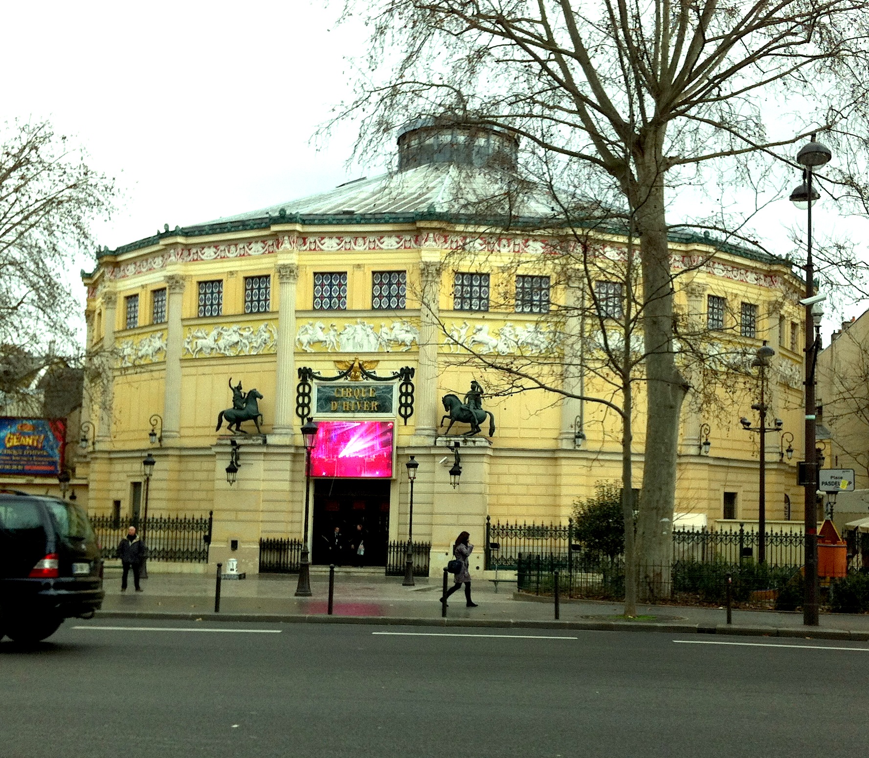 The Cirque d’Hiver is just up the street. There is a big screen on the outside of the building. It is all flashing lights and images. The screen is there to tempt people from as far away as across the street with the excitement awaiting them indoors. I have stepped into the foyer and seen the drawn portraits of the four Bouglione brothers. They are Joseph, Alexandre, Sampron, and Firmin. They are the third generation of Bougliones running the circus. I have never been inside for a performance but I enjoy walking up the side street beside the building. In the mornings there are deliveries of hay for the animals. A big truck brings bales of hay or straw and it gets unloaded into the side of the building. I never know if I am looking at straw or if I am looking at hay. The deliveries are at certain times. There is a sign on the door to announce the hours. Maybe the deliveries are done every day or maybe a few times a week. White plastic bins, upside down, are left in position to stop people from parking in the delivery zone. When the big side door of the building is open the sounds of the circus being fed and exercised and cleaned is thrilling. I am always hoping to see an elephant or a lion. On a windy day there is straw scattered on the street and the pavements. I guess the old stuff must be taken away each time when a new load arrives. Some of the straw or hay is for bedding but some is probably for eating. I should spend a little more time up there watching the movements at the side door, especially since the hours are listed. EVH