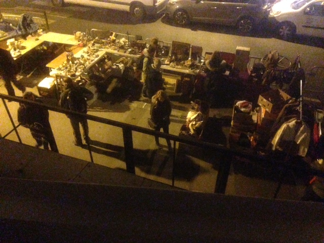 The police put a note on the front door. It was about parking. Actually it was about not parking. It was about not parking on the street on Thursday the 28th through Sunday the 31st. It was about restricted parking even at night during those dates. On Wednesday there were lines spray-painted on the curb of the footpath. Each section between two lines had a number. The sections were equal and each was maybe 3.5 metres. I decided that the numbers and the sections were about some digging up to be done. I wondered how digging and putting back together could be achieved in just four days. On Thursday large vans began to arrive. Most of the vans were white. A lot of furniture and stuff was unloaded. Tents were put up. Some of the stuff was packed into tents and then the tents were closed up or they were tied up tight with rope. Through the night more vans and trucks appeared. The vehicles were blocking the side streets. Some stuff got unloaded and was left covered by plastic sheets and some was left out in boxes and on tables. A lot was probably still inside the vans. The vans and trucks stayed where they were all night. Instead of going very quiet late last night, the street remained active in a not normal way. At 5.30 we woke up. It was not because of noise. It was just the sense that something was different outside. Looking out we saw tables had been set up on both sides of the street. People were going from table to table in the dark. People were carrying flashlights. No one was using smart phone torches. They were using flashlights and looking at the stuff which was out for sale. Tables were uncovered. Tents were open. From two floors up we could look down on the tables but we could not see much of anything because individual flashlights did not illuminate much for us from up here. Neither did the street lights. As the day got lighter it was easier to see things. It was the first time I had looked down at a flea market from above. It all looked scruffy and disheveled. Later, as we walked through at street level the objects for sale looked much more interesting. There was furniture and clothing and ironed tablecloths and huge numbers of small chairs for children in a vast variety of styles. There were table lamps and dishes and frames and signs and the entire contents of shops which must have been bought up and brought here to sell. There was hospital equipment. The tables and displays and tents continue for blocks and blocks and around the side streets and everywhere. This sale of brocante was planned for November but was cancelled after The Terrible Events of that month. It is now being held to cheer up the month of January. Today is bitterly cold and there is a sharp wind. I wonder how everything will be stored and covered over for tonight. I wonder if tomorrow will bring an even bigger crowd. I shall need to go out and wander through it all again. There will no doubt be new things to see. At the very least the things on display will be organized in a different way after a night under cover so they will look different.