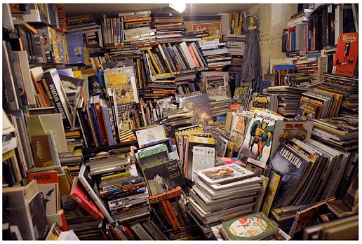 The route from the Porte de Vanves down in the south west corner of the city begins by following the tracks out of Montparnasse station, as they go first south, and then west towards the heartlands, and on even further west to the pounded rocks of the Atlantic in Brittany. As soon as you leave the exit you come upon an oversized pigionnier, that just about rescues the birds from the electrical paraphernalia of the tracks. Turning into Rue de l’Ouest, you can see the tower at Montparnasse from the uncomfortable angle of edge-on, and once again you realise how small and compact the city is. We join the Avenue de Maine and cut through the bus station, to visit a purveyor of brocante at the end of Rue Vaugirard just off the boulevard.It’s a straight line for home almost, through St Germain and Place St Michel, past Notre Dame and the surrounding bridges, across Rue de Rivoli and into the Marais. But not without calling to see, on an annual visit, Un Regard Moderne, the tiny bookshop at No.10 Rue Git le Coeur run by the lifer Jacques Noel. The street was made famous by the fairytale hotel lived in by Ginsburg, Corso and Burroughs in the late fifties and early sixties, as everybody knows.We caught Jacques reading on the doorstep, where there was just about enough light to see. More than can be said for the interior of the shop, which appears now to be homogenously solid with the stratification of books that can only be extracted with a shovel. It’s really a Merzbau, less to do with reading than with accretion. Jacques may have his own private supply of discrete volumes, which he secretly keeps under the counter for moments like this when he’s forced to the edge. Books will finally bury you if you live with them like he does. SC