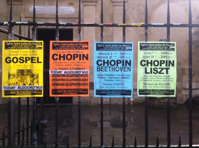 Posters for music performed in churches appear regularly on certain walls and fences. They are always photocopied on attention getting pieces of coloured paper. The posters are always the same year after year. The churches might be different and the composers being performed may be different but the format and the bold black letters remain the same. I sort of feel like the music might be the same too. The only new note is an added strip of white paper announcing TODAY AUJOURD’HUI in capital letters.