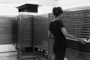 There are eleven of these wheeled shelving units, each with twenty two drawers. In each drawer is the name of a station in Germany, painted on boards, each of them of six letters, 242 place-names in total, taken from a 1948 freight directory first published in 1943. They are rendered in the modernist type of the German rail system