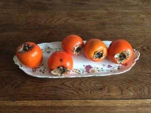 Everything is a vocabulary lesson. KAKI is the word for Persimmon. I do not know much about persimmons. We bought two and ate them mashed up in a bowl with a dollop of creme-fraîche on top. They became the most amazing sweet pudding ever. The sweetness was all the natural sugar of the fruit. It was exquisite. It tasted of warm places. We were so excited by the newness of the flavour that we bought five more kaki fruit. Then we learned that a nice fresh firm persimmon is essentially useless. We have to wait for it to turn brown and rot and look horrible from the outside before it is sweet and mushy on the inside. I check the five every day. Several times a day. It has only been six days so far. Two of them are a little bit brown on the bottom. We might have to wait for as long as five weeks. At this rate that feels like forever. And I must remember to call the persimmons by their French name. EVH