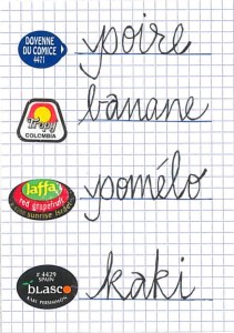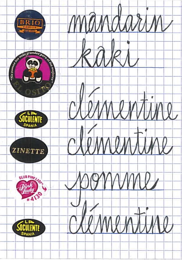 I too remove labels from fruit but increasingly I have been doing it in order to save the labels. I began to line them up on a gridded card and then I wrote the name of the fruit in French. I was able to do this as a way to trick myself into believing that it was a vocabulary-building exercise. The only two fruit words I did not already know were those for Persimmon and Pomegranate. Now that I know these words are KAKI and GRENADE, I am no longer learning any new fruit words. But I am still collecting the labels. Vegetables do not have stickers on them. There is no chance that my learning will extend in that direction.